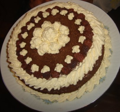 Cortar en tres capas. Mojar con almíbar al coñac o al cassis (también se puede usar el jugo de las frambuesas al natural diluido por partes iguales con agua y azúcar) e ir rellenando con crema chantilly y unas frambuesas o cerezas distribuidas sobre la crema.