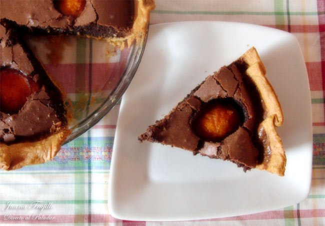 Verter sobre la masa horneada la mezcla de chocolate. Distribuir sobre el chocolate las mitades de albaricoque.