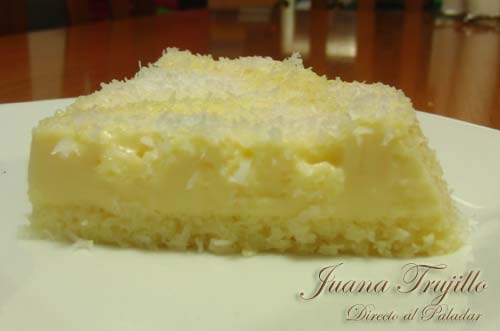 Desmoldar en frío girándolo sobre una bandeja. Espolvorear con el coco rallado restante. Nos debe quedar, al darle la vuelta, como un flan blanco en la parte de arriba, y el coco, al igual que una capa fina de bizcocho, al fondo.